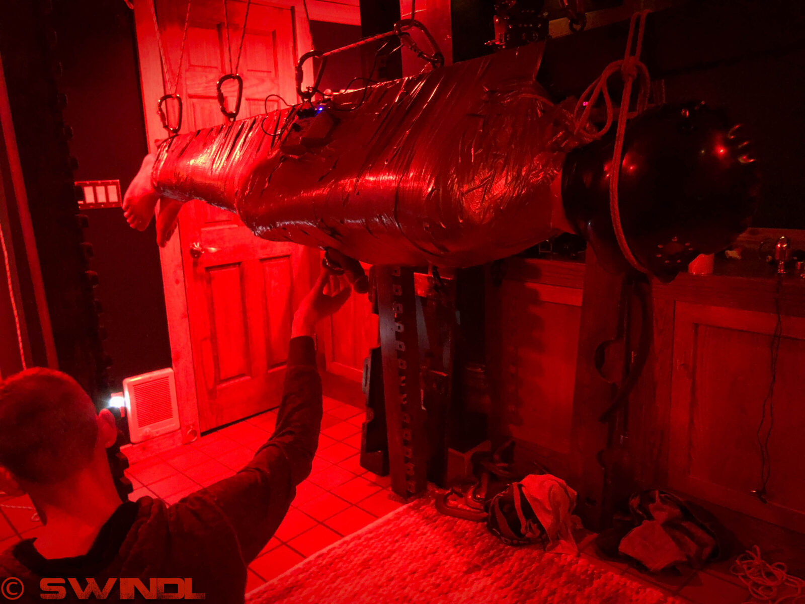 Mummified to a plank and suspended face down. The fun is letting him down and cutting off the tape –…